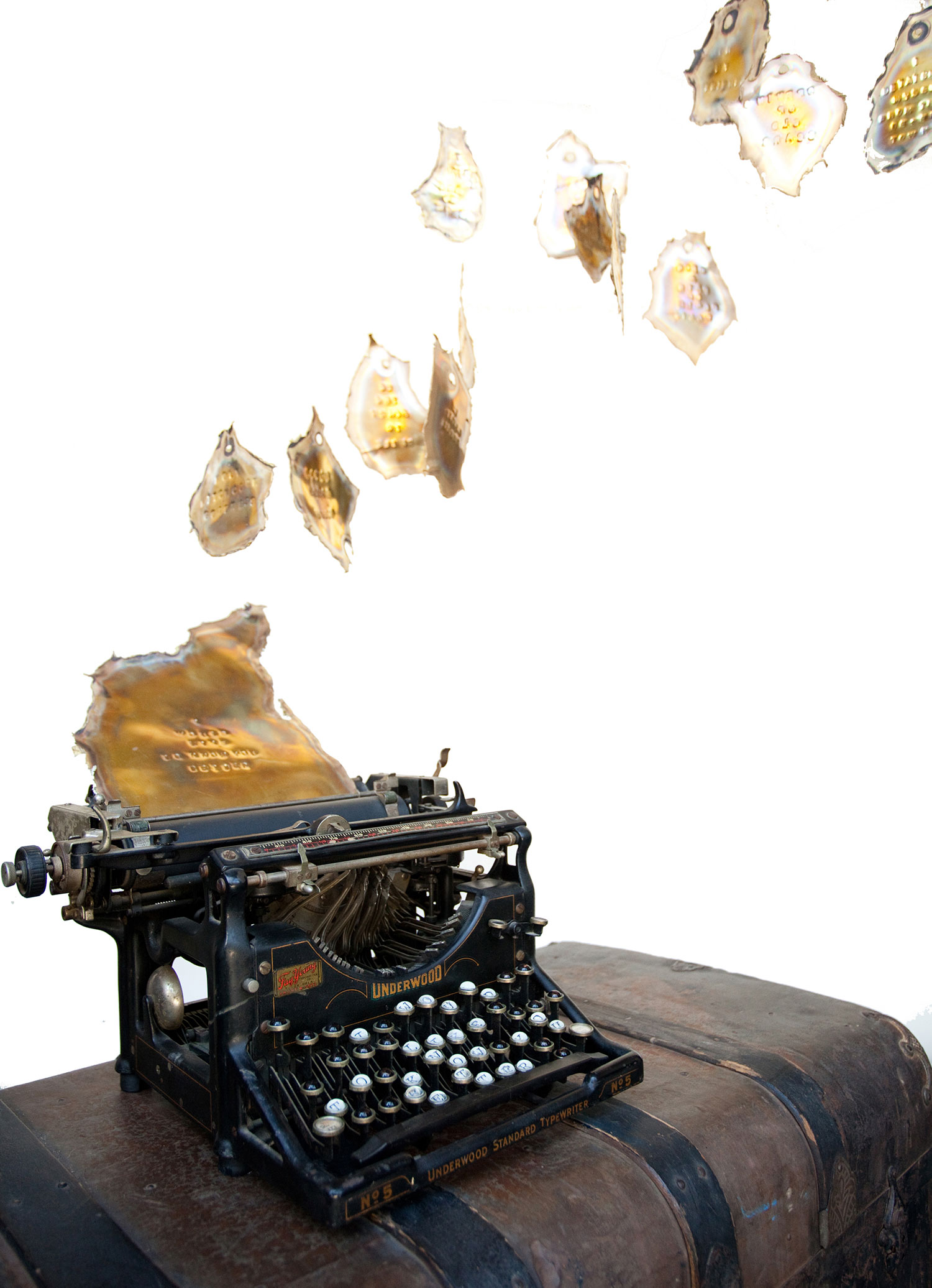 Friend's Facebook status updates hand stamped on brass sheet, hanging from monofiliment. Floor to ceiling installation. (2011)